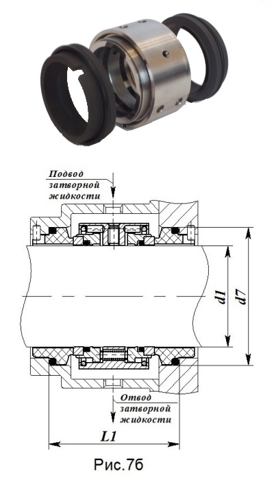 В зависимости от конкретных условий эксплуатации изготавливаем различные варианты таких уплотнений - с двумя центральными пружинами (например, для насосов SIEVA 10 и SIEVA 20 - рис.7а), многопружинные ( для насосов с диаметрами валов до 100 мм). Для герметизации агрессивных сред на предприятиях химической и нефтехимической промышленности изготавливаем варианты двойных уплотнений с вторичными уплотнениями из фторопласта.